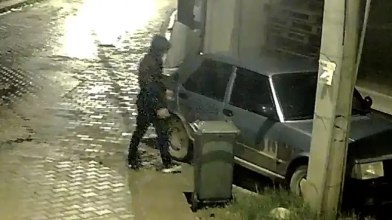Sokağa yürüyerek giren şüpheli park halindeki 16 ANH 999 plakalı aracın kapısını zorlayarak açtı. Araçtaki teyp ve malzemeleri alan şahıs, sokaktaki apartmanın girişine malzemeleri sakladı. 5 dakika sonra başka bir araçla olay yerine geldi. Geldiği apartmanın girişine sakladığı çaldığı malzemeleri araca koyarak kayıplara karıştı.