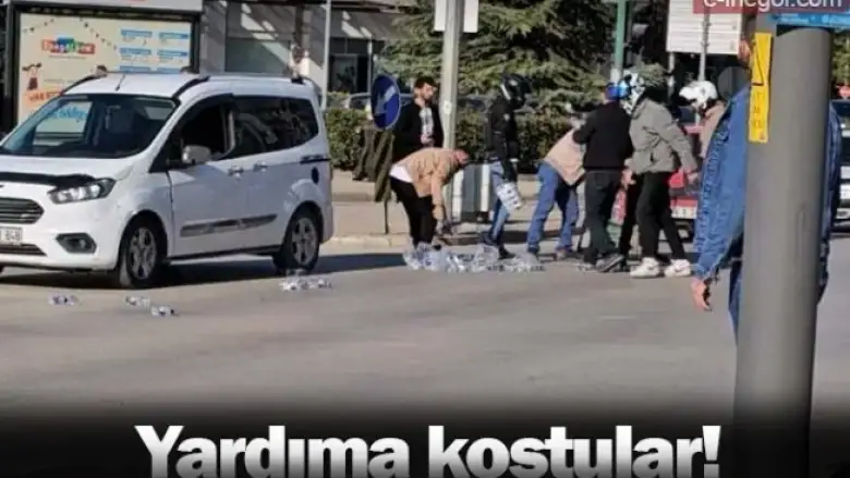 Yola saçılan suları gören vatandaşlar, suları toplayıp motosikletin sürücüsüne yardımcı oldular.